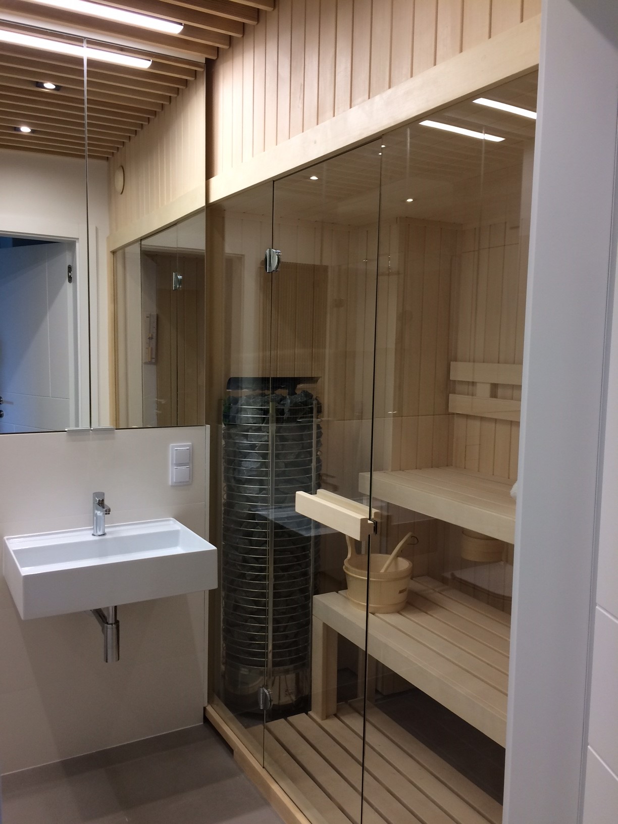 W łazience zdecydowaliśmy się na typowo skandynawskie rozwiązania, które przywodzą na myśl fiński styl życia. Jej serce stanowi sucha sauna fińska z lipowego drewna. Dzięki przeszkleniu, wpisuje się w łazienkę optycznie powiększając jej przestrzeń.