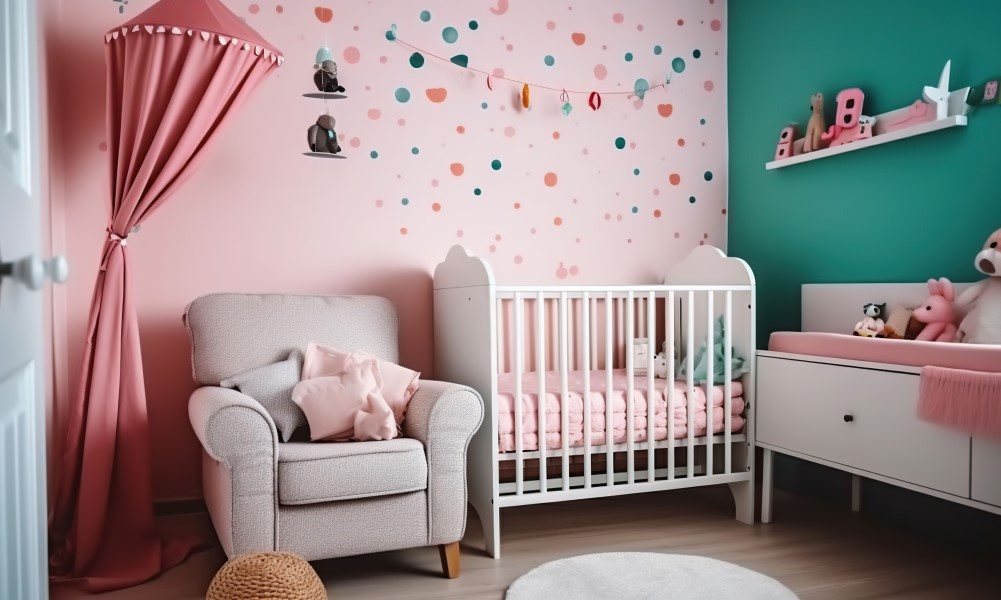 Niemowlę większość czasu spędza w łóżeczku. Dlatego warto urządzić dziecięcy kącik w sypialni lub w pobliżu miejsca, w którym najczęściej wypoczywają rodzice. Na taki krok decydują się najczęściej nie tylko posiadacze kawalerek, ale także dużych domów. Najważniejszym krokiem w organizacji kącika dziecięcego jest wydzielenie części dla niemowlaka i opiekunów. Można zrobić to za pomocą prostego zabiegu, czyli przemalowania pomieszczenia na dwa kolory, które naturalnie je podzielą. Część dla dziecka mogą zdobić jasne, pastelowe barwy, a metraż rodziców bardziej stonowane odcienie.