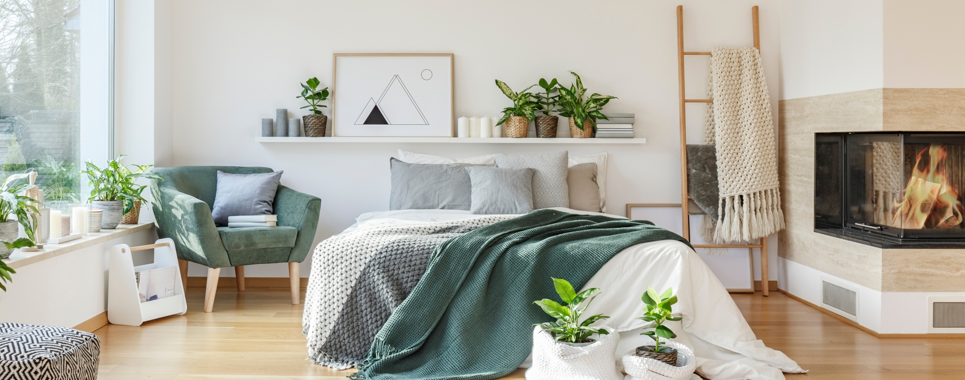 Pamiętaj także o dodatkach, dzięki którym sypialnia stanie się przytulna. W ekologicznym pomieszczeniu postaw na len, bawełnę czy wełnę. Narzuty, koce oraz poszewki na poduszkę wykonane z tych materiałów będą pięknie wyglądać i dadzą poczucie komfortu. W oknach zawieś jasne zasłony, które dopełnią aranżację. Warto też rozejrzeć się za dodatkami z drugiej ręki. Kupione na pchlim targu figurki, obrazy czy pojemniki na biżuterię idealnie wpisują się w trend naturalnie zaaranżowanej sypialni.